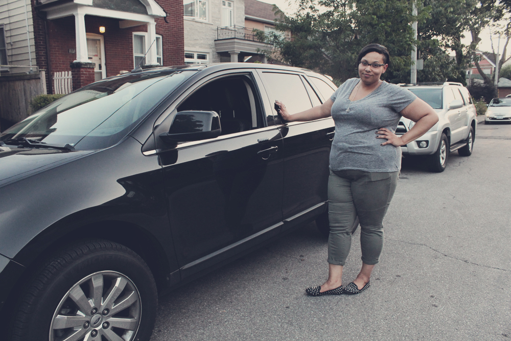 Generally speaking, I definitely dress up a bit more in Toronto than I do in Edmonton (sorry kids). Beyond having to adjust to the unique weather challenges that Edmonton poses (try finding a winter coat that will keep a fat girl warm in -40 and isn’t completely fugly and shapeless), I think I have a tend to dress down a bit more in Edmonton as a way of blending in. In Toronto, it isn’t as surprising to see a fat woman or a woman of colour who is wearing something creative or interesting or different. In Toronto, I feel like I’m just another woman in an interesting outfit on the street or the subway. But here, I often feel so conspicuous as it is due to my size and my race (and my decidedly queer haircut)  that wearing my bright pink pants or a loud print as well just feels like drawing even more of the wrong kind of attention to myself.